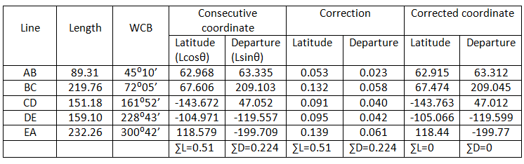 v. Apply necessary corrections to the latitudes and departures of the line so that ƩL = 0 and ƩD = 0. The correction may be applied to either the transit rule or compass rule depending upon the type of traverse.